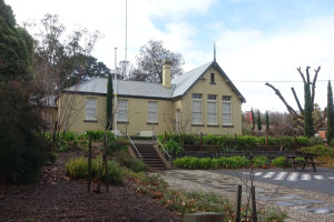 The bichrome brick school building, built c. 1870s, located in the south-east of the site is a small single-room school building with gable ends and a gabled porch, steeply pitched roof…